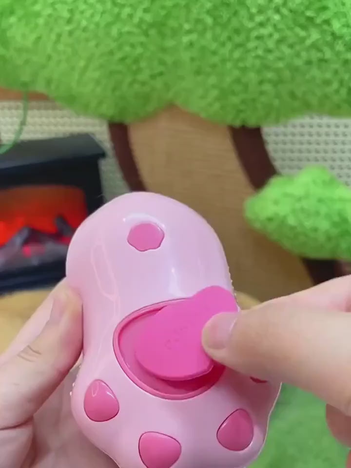 A product shot of the pink paw-shaped pet steamy brush, showing the steam function in action.