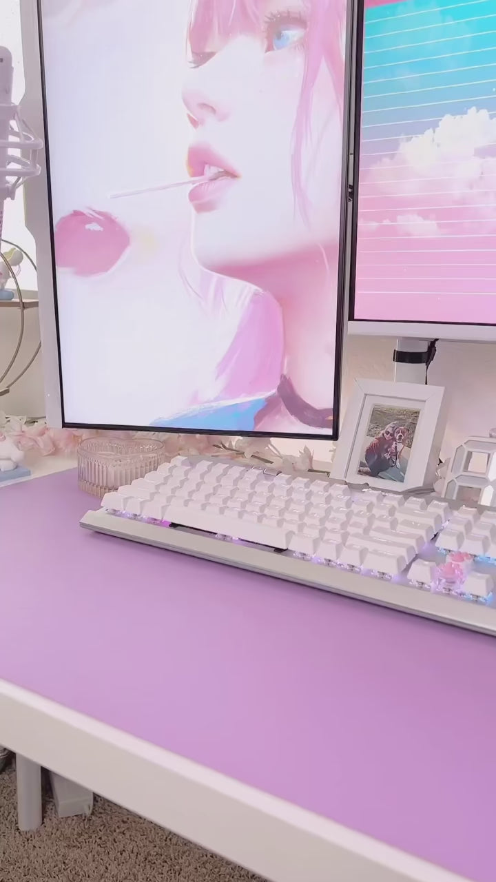 A pink-themed gaming desk setup featuring the pink Redragon GS520 speakers, a pink keyboard, and a large mousepad.